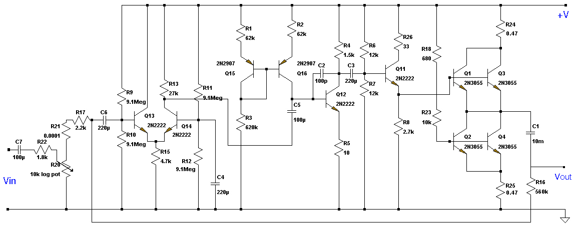 This is the circuit diagram of 24 Watt class A linear audio amplifier, built and tested by Marc Klynhans from South Africa. The supply voltage can be between 34V and 46V and the quiescent current should be set to 1.7A measured through R25 (a voltage of 0.75V must be measured over R25 for a quiescent current of just under 1.7A). R23 is a trimmer and must be set to maximum resistance (10kOhm) when powering up. Then the resistance of R23 must be decreased until the the quiescent current is achieved. If the amplifier is mounted on a big enough heatsink ( 0.6K/W at most) then the amplifier is very safe from thermal runaway. Intelligence must be used when choosing power and voltage ratings of resistors and capacitors.