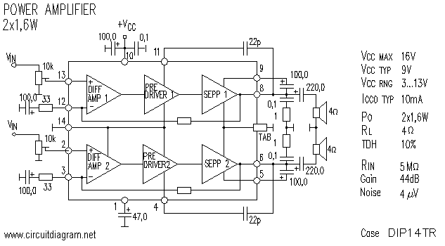 This is another stereo / dual power amplifier circuit with power IC KA series. This amplifier delivers dual power output (stereo) at 1.2W for each channel. General
