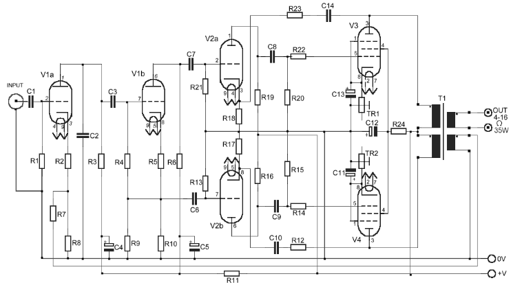 It is a classic design of power amplifier 35 W using tube, with two EL34 in connection Push-Pull, by Siemens & Halske, with design date 03/24/1953 and code SV410 / 1. The amplifier worked from 1954 to 1989, whenever and went off, with an average lifespan of 15 hours a day. Showed no particular damage beyond the replacement tubes, resistors and capacitors, resulting from natural wear.