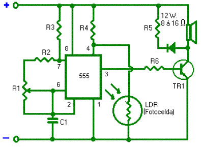 When the LDR / photocell is receiving light, has low resistance, thus blocking the positive voltage that gives R4 to terminal 4 of IC 555, maintaining multivibrator off and the speaker does not sound when the photocell stops receiving light, its resistance increases in fraction seconds, which makes it reaches the above positive voltage to the terminal, which activates the alarm.