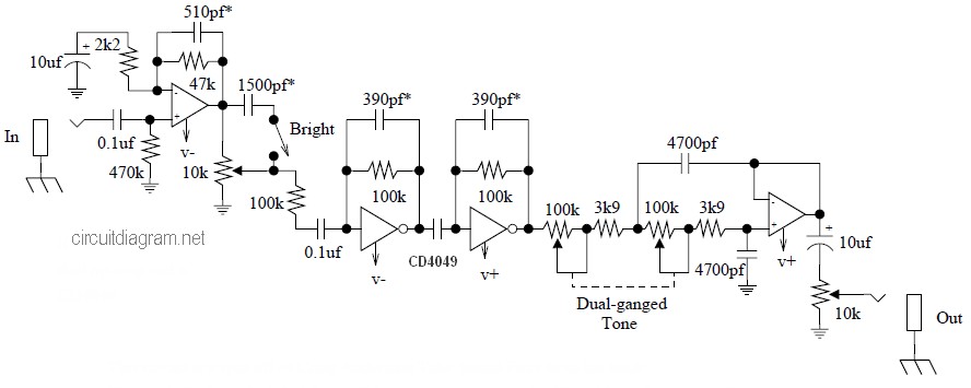 This tube sound fuzz mods circuit is taken from the book of Electronic Projects for Musicians by Craig Andertons. This circuit applies a CD4049 Hex inverter, which consists of six inverting units. Only two are being used in this circuit, so the others are disabled by connecting their inputs to the positive voltage source and leaving the output disconnected. Components with a * are suggested values, substitutions can be made freely within 30%.