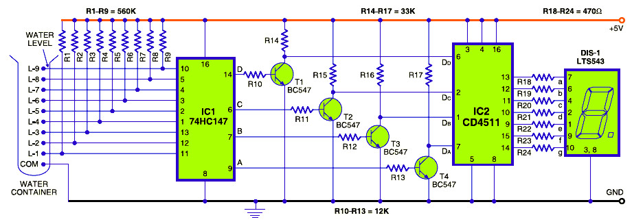 The ground terminal of the sensor must be placed and maintain at the bottom of the container (water tank). IC 74HC147 has nine active-low inputs and converts the active input into active-low BCD output. The input L-9 has the highest priority. The outputs of IC1 (A, B, C and D) are fed to IC2 via transistors T1 through T4. This logic inverter is used to convert the active-low output of IC1 into active-high for IC2. The BCD code received by IC2 is shown on 7-segment display LTS543. Resistors R18 through R24 limit the current through the 7 segment LED display.